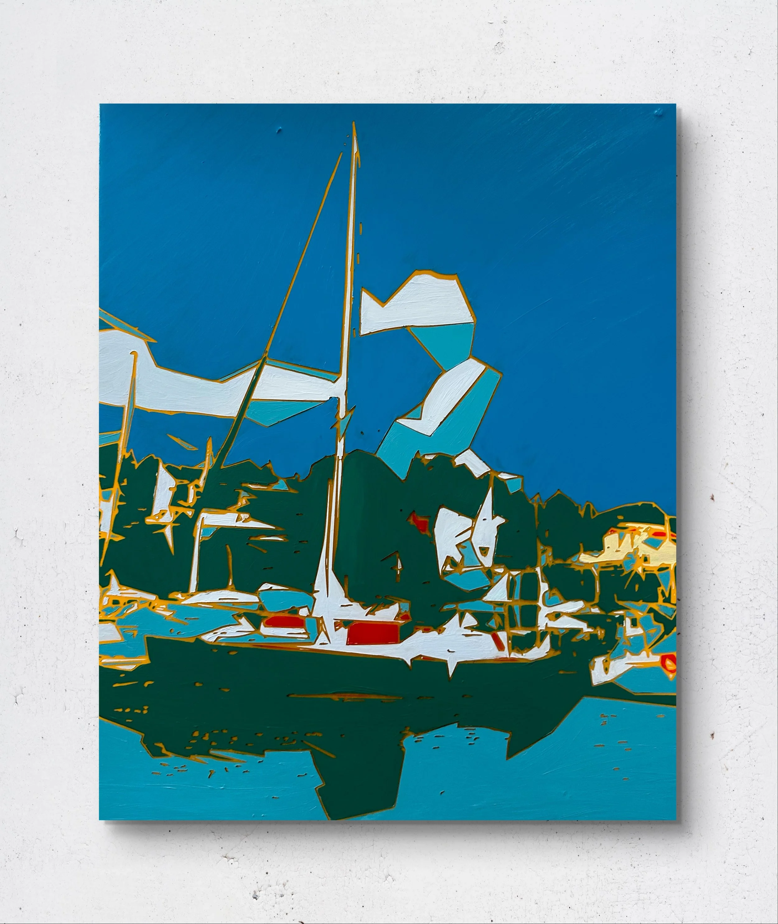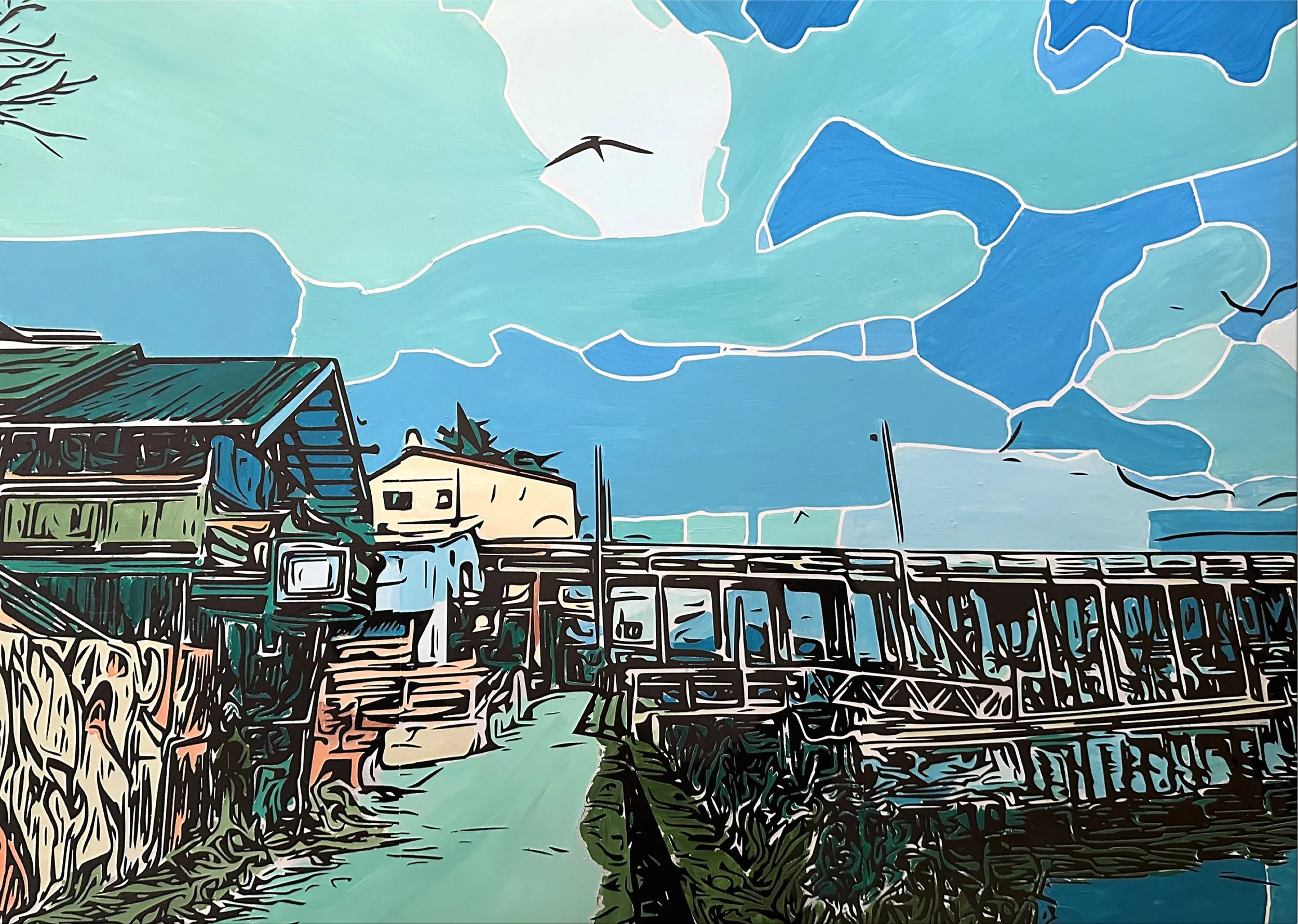 Jess Hart is an artist living and working on the unceded lands of the shíshálh and Sḵwxwú7mesh peoples in Gibsons, BC. She creates unique contemporary and abstract artwork featuring coastal and urban scenes. Combining techniques of graphic design and silk screen printing, she enjoys experimenting with watercolor, acrylic, resin and mica powder to produce a dynamic style. A veteran musician who has performed across Canada and toured in Europe, she was inspired by screen printing to start painting and exploring new mediums and came to develop an interesting method and outlet for her creative expression. Employing high detail die cut stencils, she layers elements with acrylic, spray paint and fluid paint which are then embedded in a high gloss resin. She creates abstract and realistic works of art with vibrant colours, enhanced by the high gloss, glass like epoxy finish. Originally from Montreal, she is inspired by the Pacific Northwest and the beauty of the Howe Sound, Sea to Sky and Coastal living since relocating in 2010.