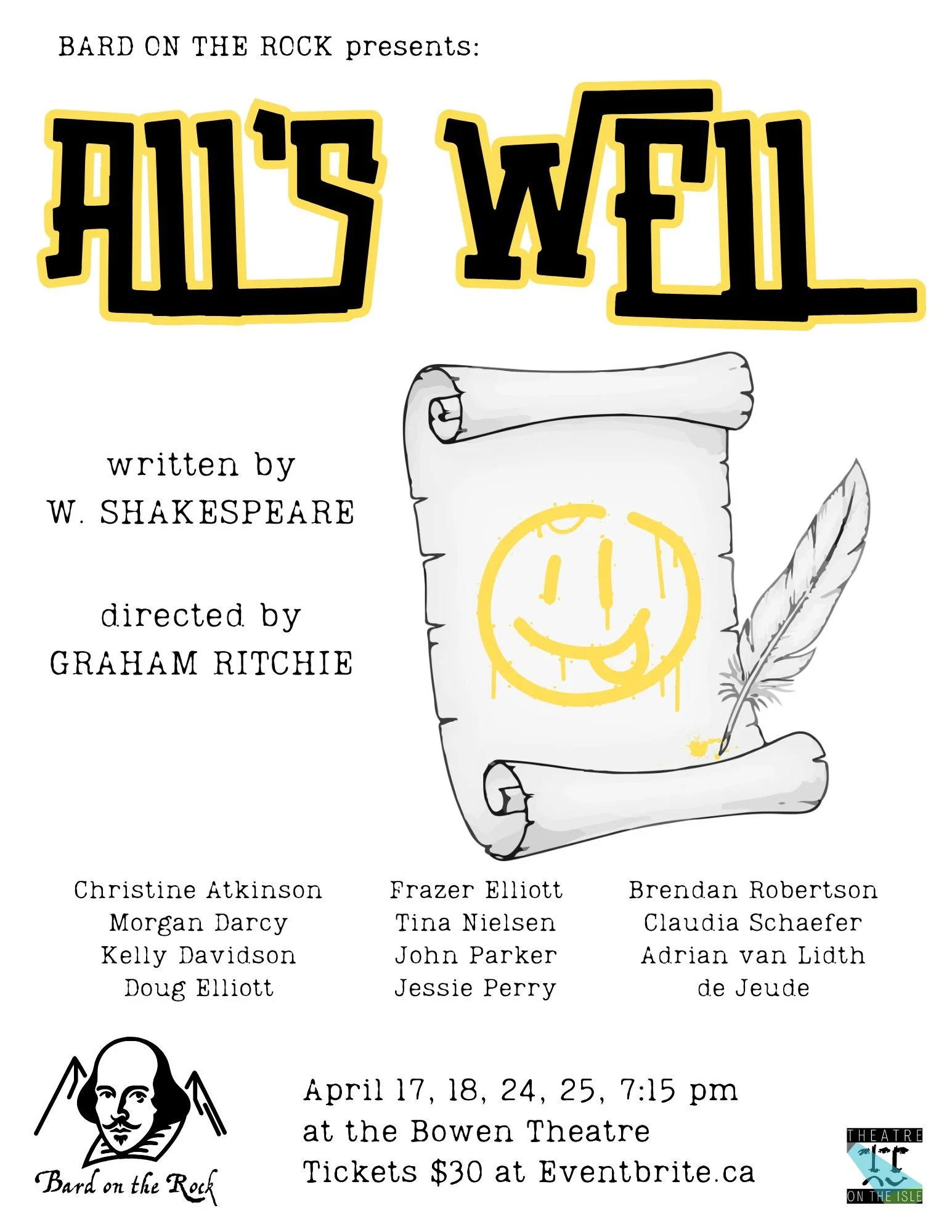 Join us at the Bowen Theatre for “All's Well”, the 11th annual production from Bowen's famed Bard on the Rock, but the first in the new theatre, and the first Spring production!