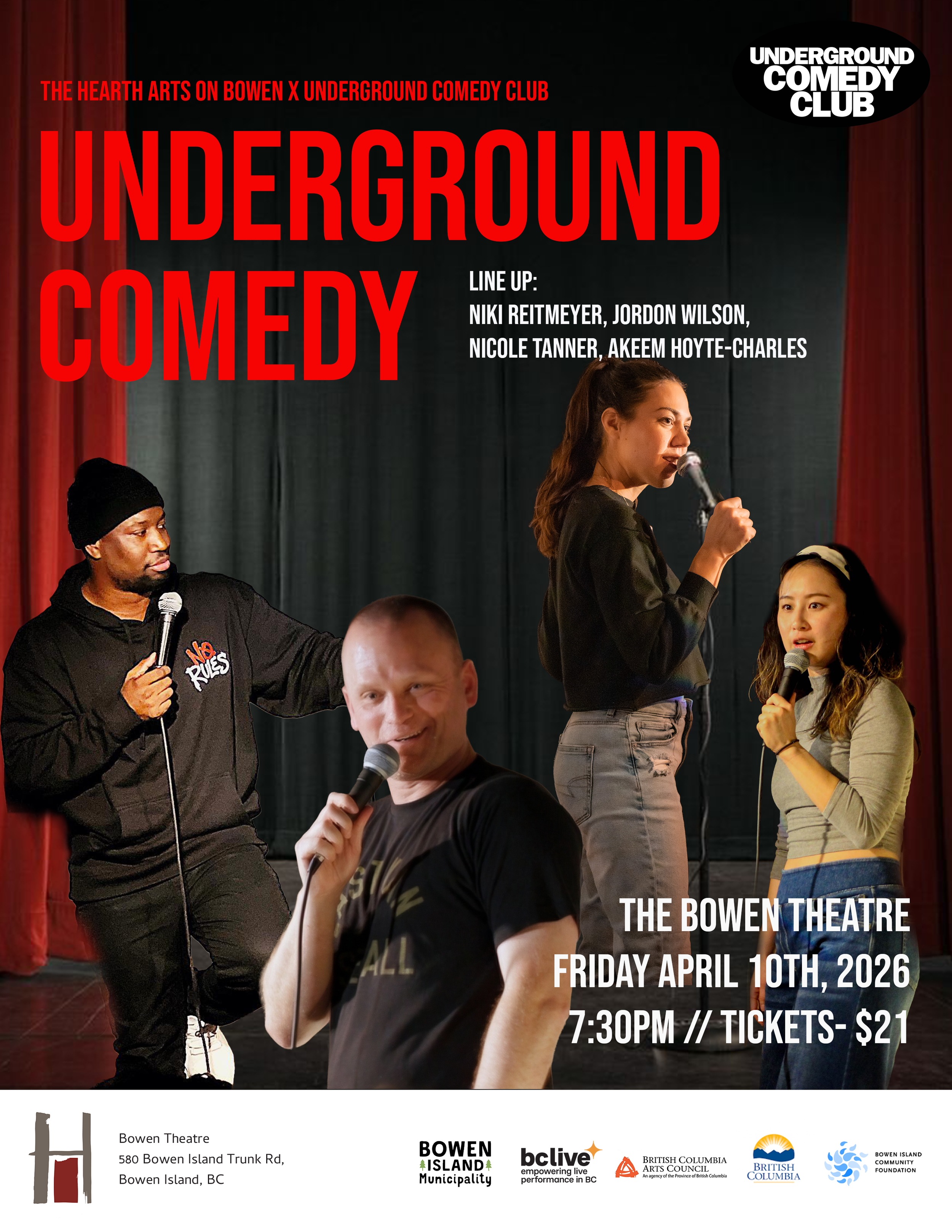 Get ready to laugh until your sides hurt at the Bowen Theatre's Underground Comedy show - it's going to be a night to remember!A professional show with the cities best comedians dropping in to perfect their sets. Acts from Netflix, CBC, Just for Laughs, Canada's Got Talent, HBO, etc.The Underground Comedy Club is taking over the Bowen Theatre for one unforgettable night of big laughs, electric energy and outrageous punchlines. Join comedians Niki Reitmeyer, Jordan Wilson, Nicole Tanner and Akeem Hoyte-Charles on Friday April 10th.