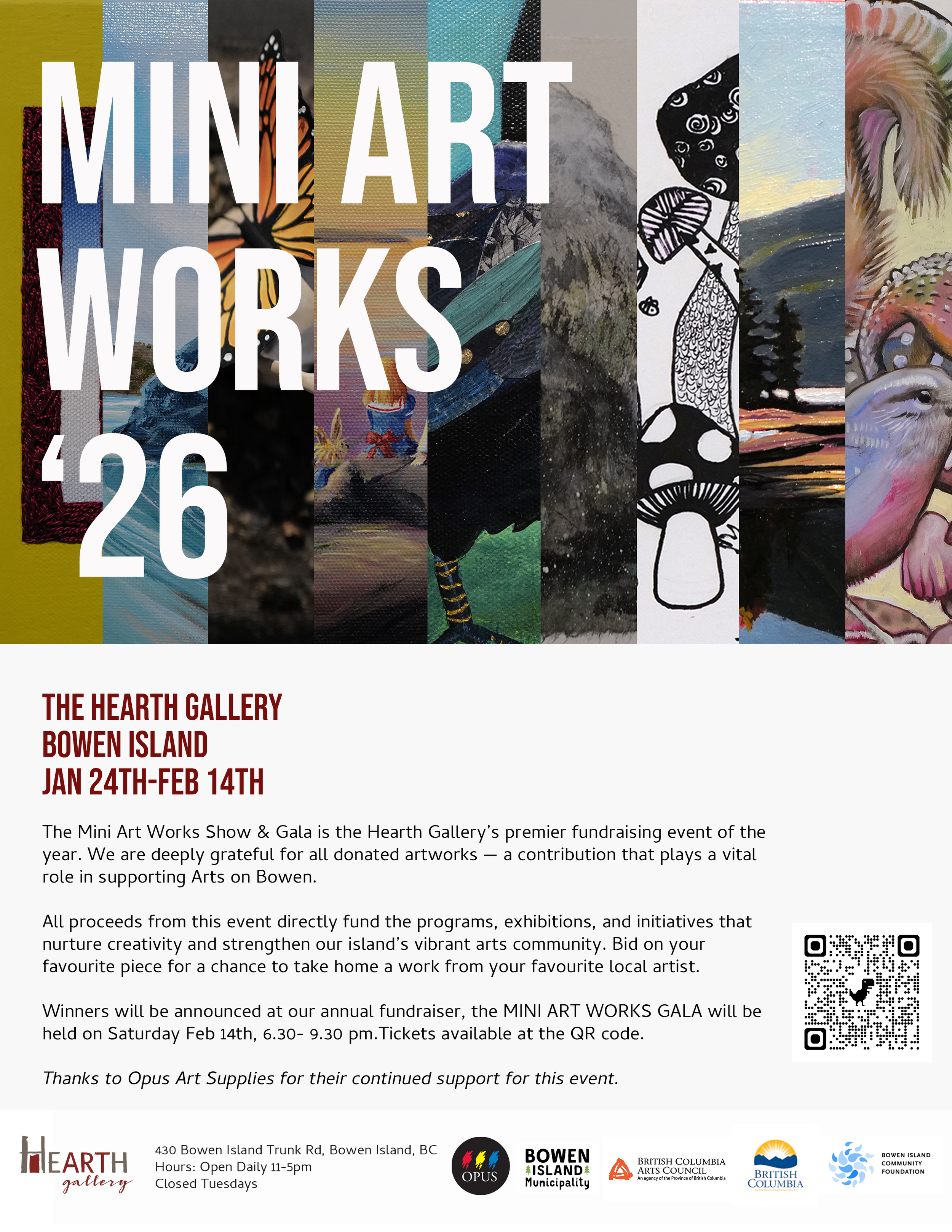 The Mini Art Works Show & Gala is the Hearth Gallery’s premier fundraising event of the year. We are deeply grateful for all donated artworks — a contribution that plays a vital role in supporting Arts on Bowen.
