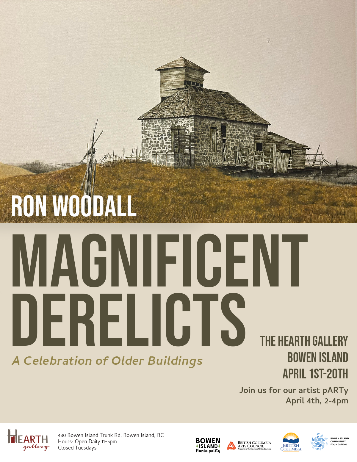 Ron Woodall’s body of work is on display in three locations: Magnificent Derelicts at the Hearth Gallery, and the Cartoon Wall plus a Private Family Collection at Arts on Bowen in the Community Centre.