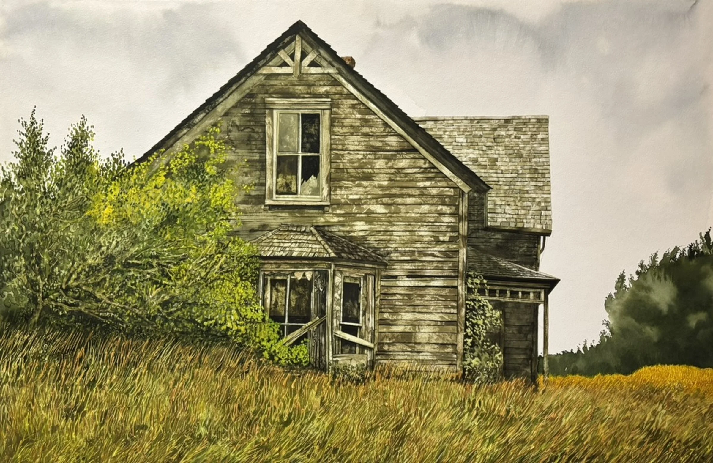 The watercolours in The Hearth Gallery, and three hundred others, have an unusual past. They were painted about 50 years ago, not as paintings, but as book illustrations. My absurd mission was a futile attempt to persuade people that abandoned vernacular buildings were a natural part of the landscape and deserved protection like wildlife or big trees. I was preaching Arrested Decay. The notion found wide appeal in the media, Time Magazine, Macleans and on national television. Eventually, Heritage Canada became my prime advocate. Of course, the notion was impossible. Almost every barn I painted has vanished. Here is some sentimentality from my first book, Magnificent Derelicts: