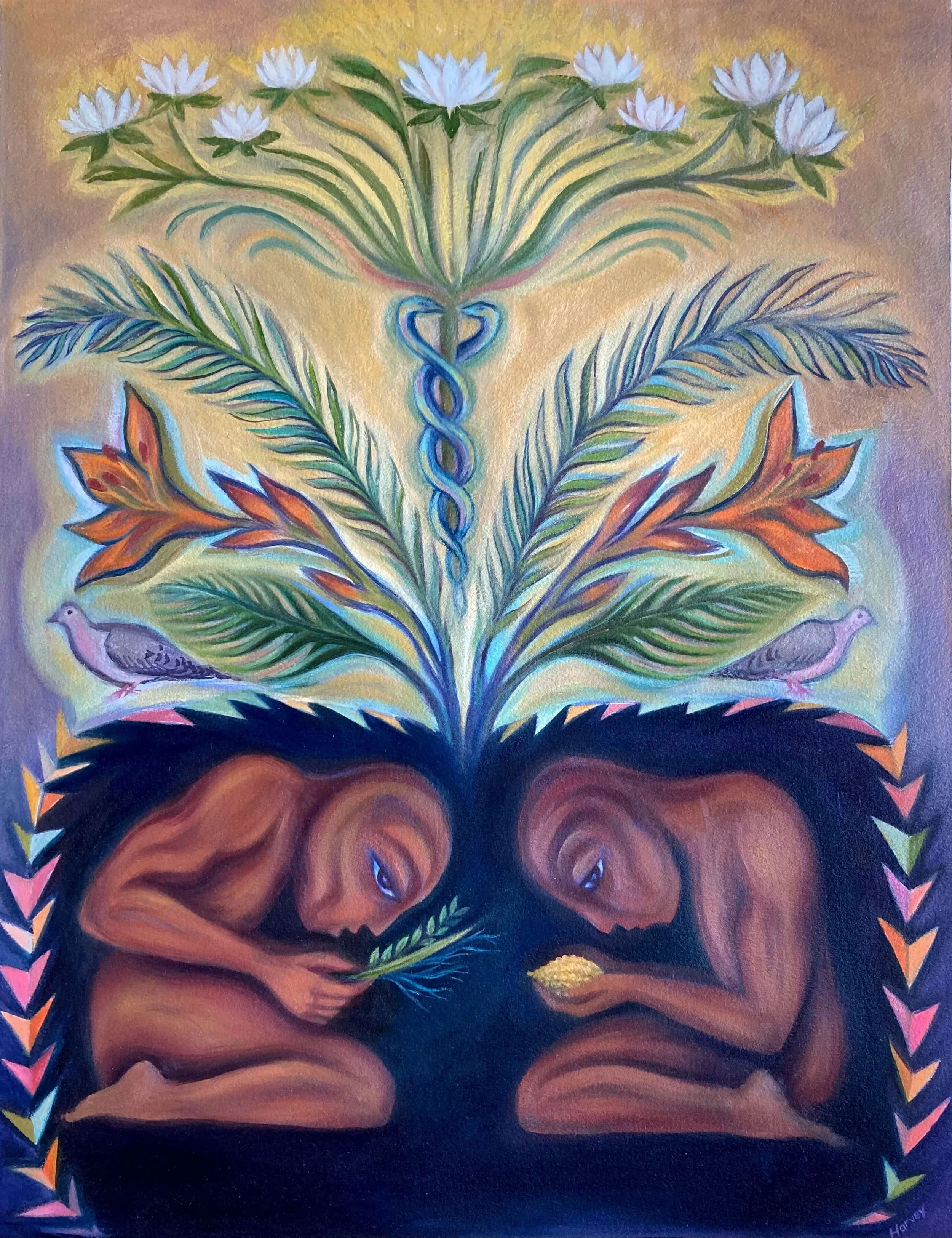 I believe in the importance of connecting with the sacred and the profound in our every-day lives. For me, looking deeply into the natural world has the power to evoke feelings of wonder and awe. In many ways, modern living has made us move away from this sense of awareness and led us to treat each other and the planet in destructive ways. In this new series of work, I took inspiration from the long tradition of devotional artwork found in many cultures. People interact with these artworks differently- they bow before them, perhaps pray or chant, clap their hands, leave flowers and glasses of water. These paintings became for me meditations on themes of nature, motherhood, and healing. I thought about the devotion we experience in our everyday lives, those moments when we experience a sense of harmony with the universe. It could be a parent watching their child sleep, seeing bats flit across a darkening summer sky, or hearing the wind move through trees.