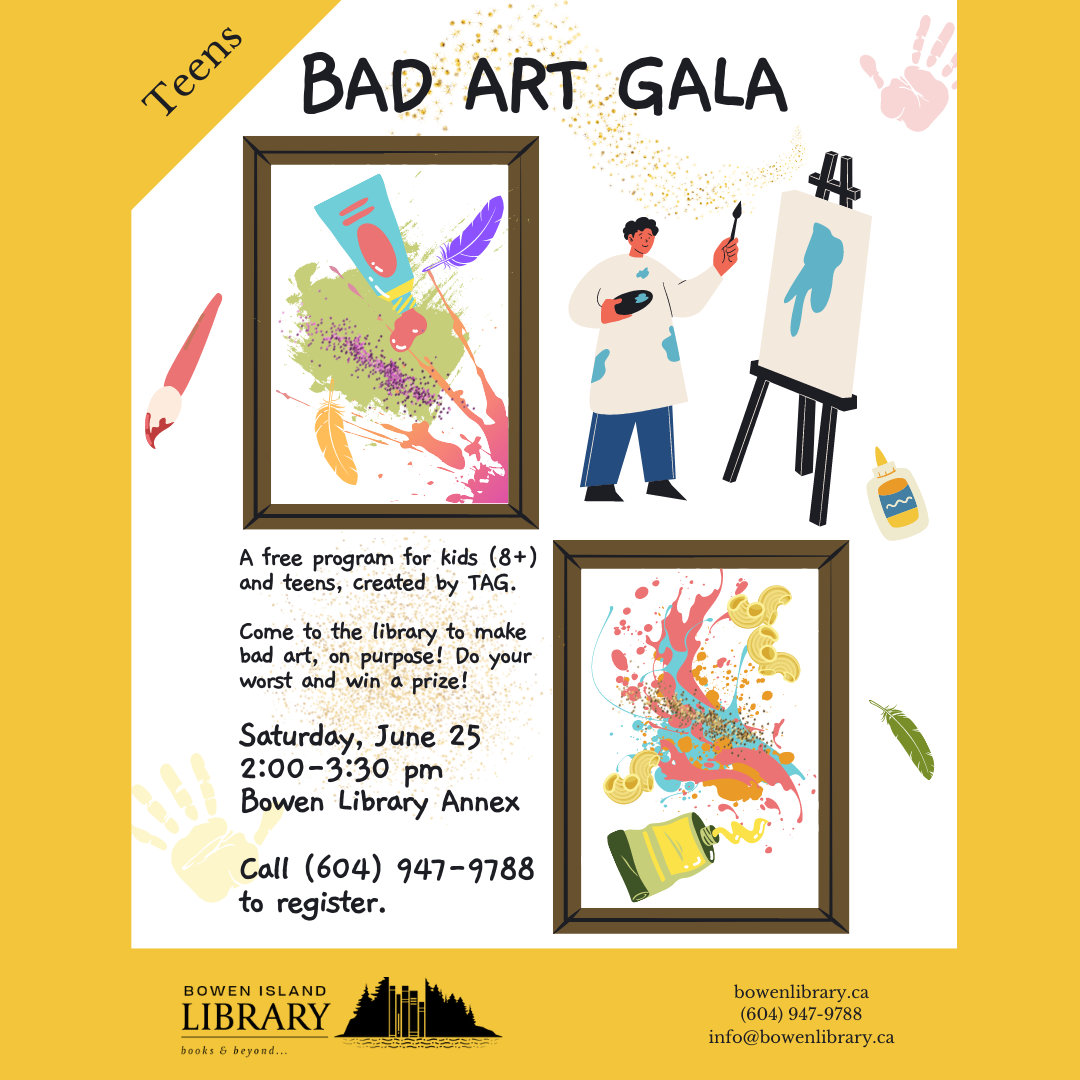 Join us Saturday, June 25 at 2 pm to create horrible art! The challenge is to make the tackiest piece of art you can in 45 minutes, using the library’s ugliest craft supplies. Then, check out other participant’s work and vote for your “least” favourite. Whoever receives the most votes will win a prize. Leave your good taste at home, and do your worst!
