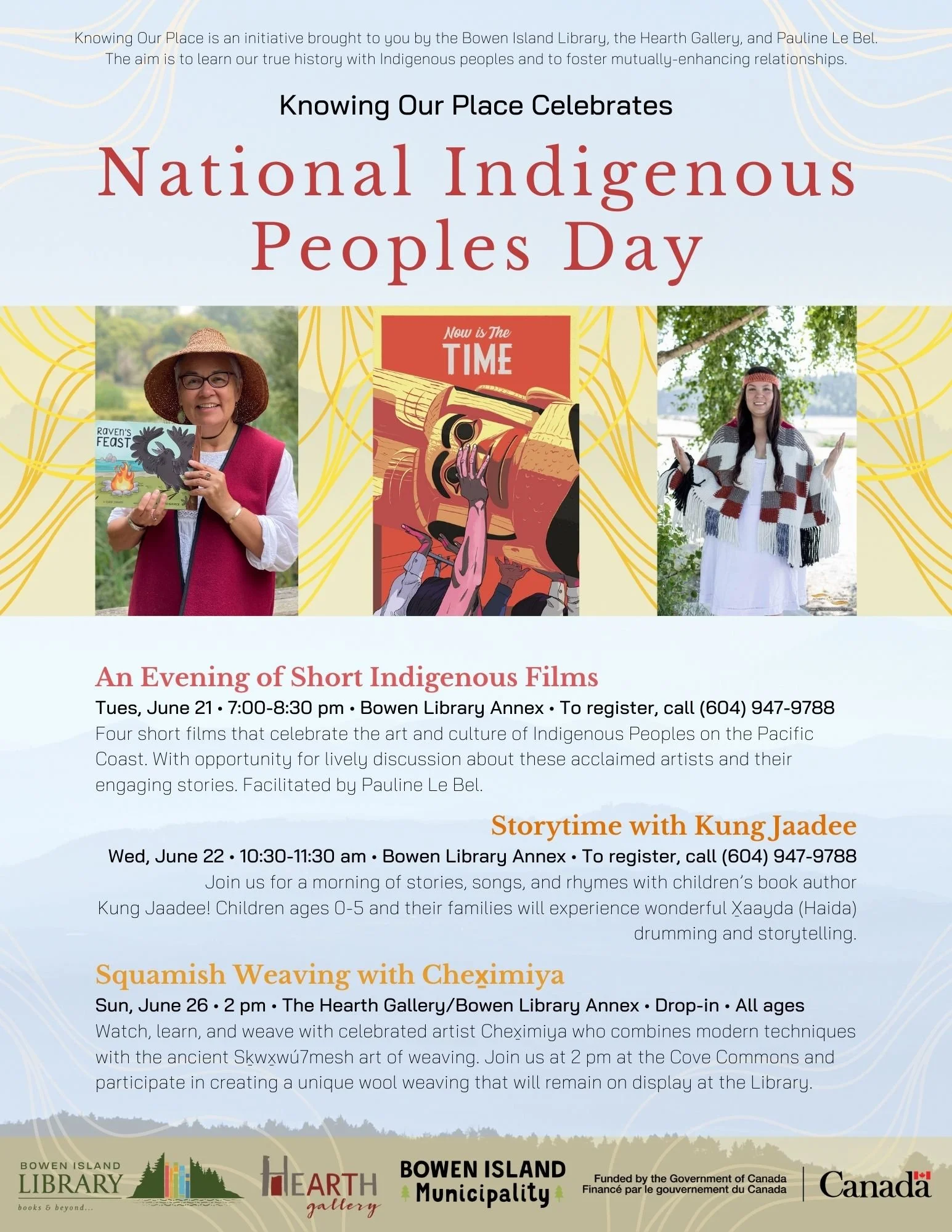 These events are brought to you by Knowing Our Place, an initiative of the Bowen Island Library, the Hearth Gallery, and Pauline Le Bel. The aim is to learn our true history with Indigenous peoples and to foster mutually-enhancing relationships.
