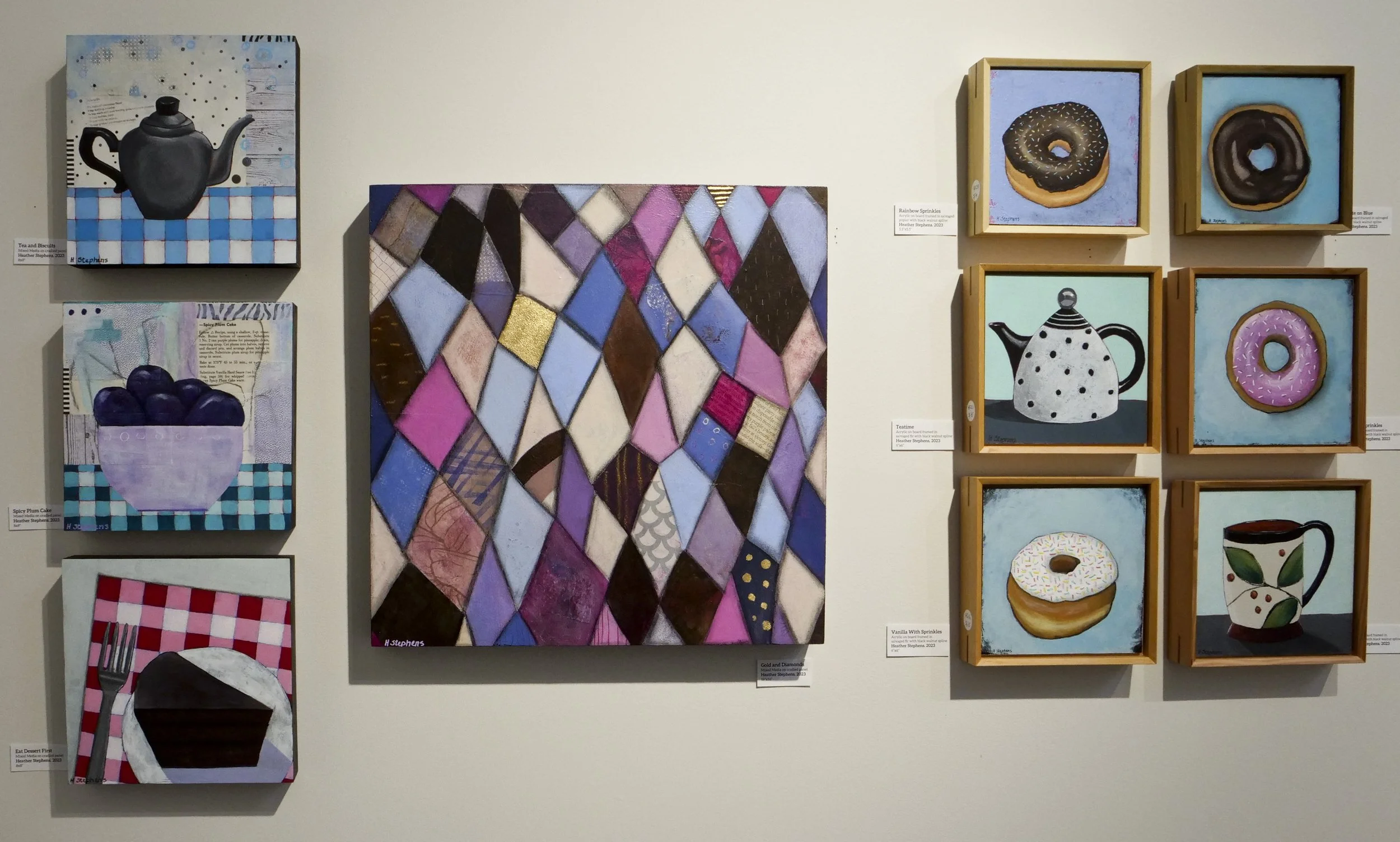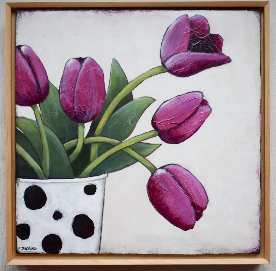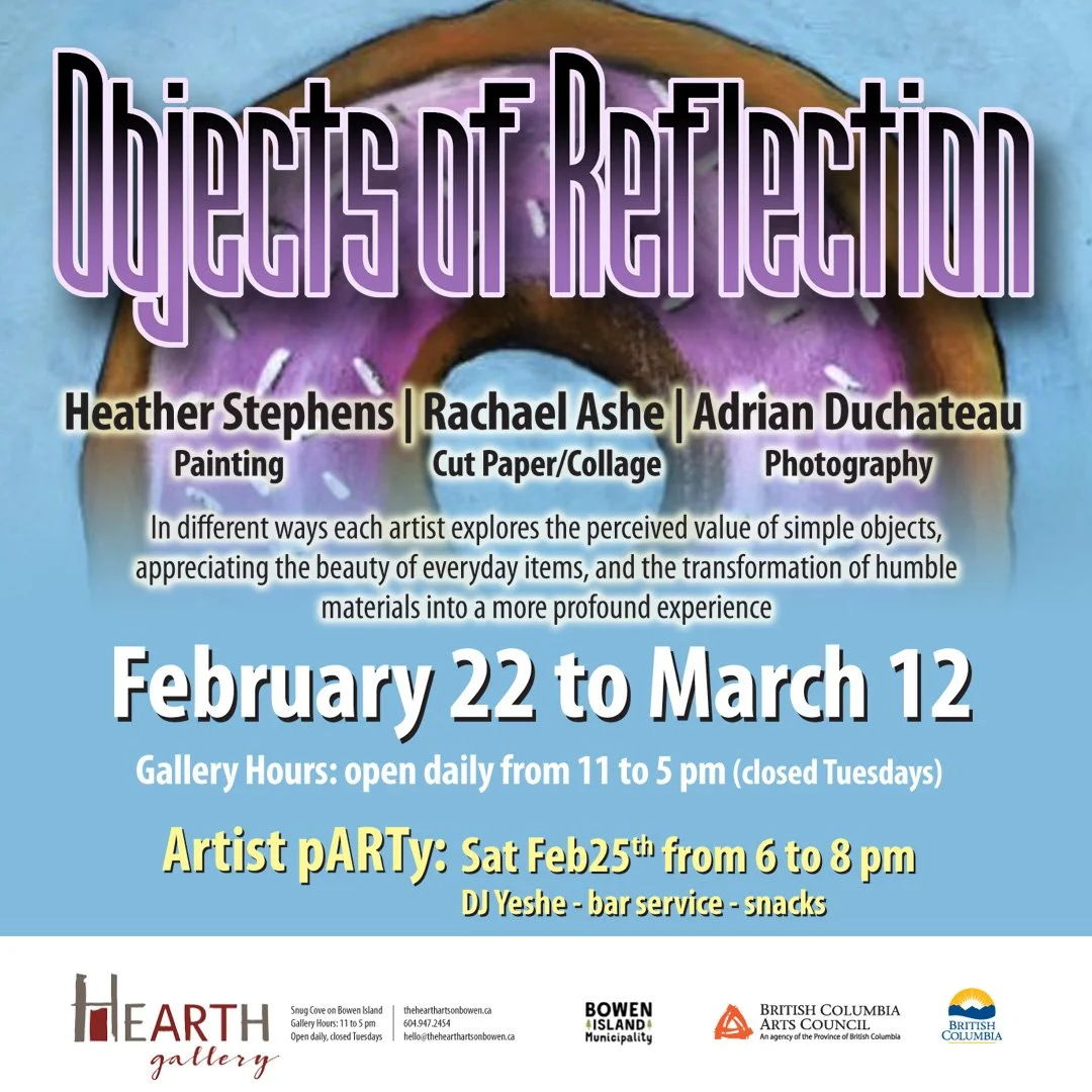 Heather Stephens is a long-term Bowen Island resident and a former teacher from BICS. A talented quilter and sewer, she has been working with painting as her new medium since she retired. What she loves the most is to stay at home and make things; to be a “Homebody”, like she says. In this exhibit, she presents her most recent body of work where she observes ordinary objects found in the kitchen - a place she calls the Heart of the Home - and represents them in a simplistic style. Her adorable folk art still life subjects as well as her more abstract paintings invite us to pause a moment and to reflect on the objects and textures embedded in our daily lives.