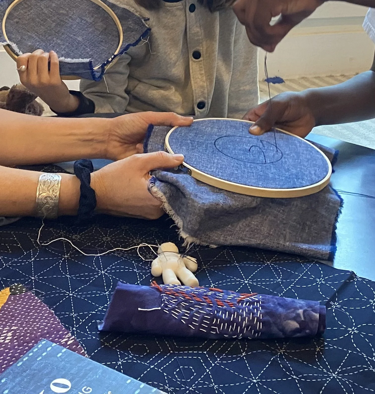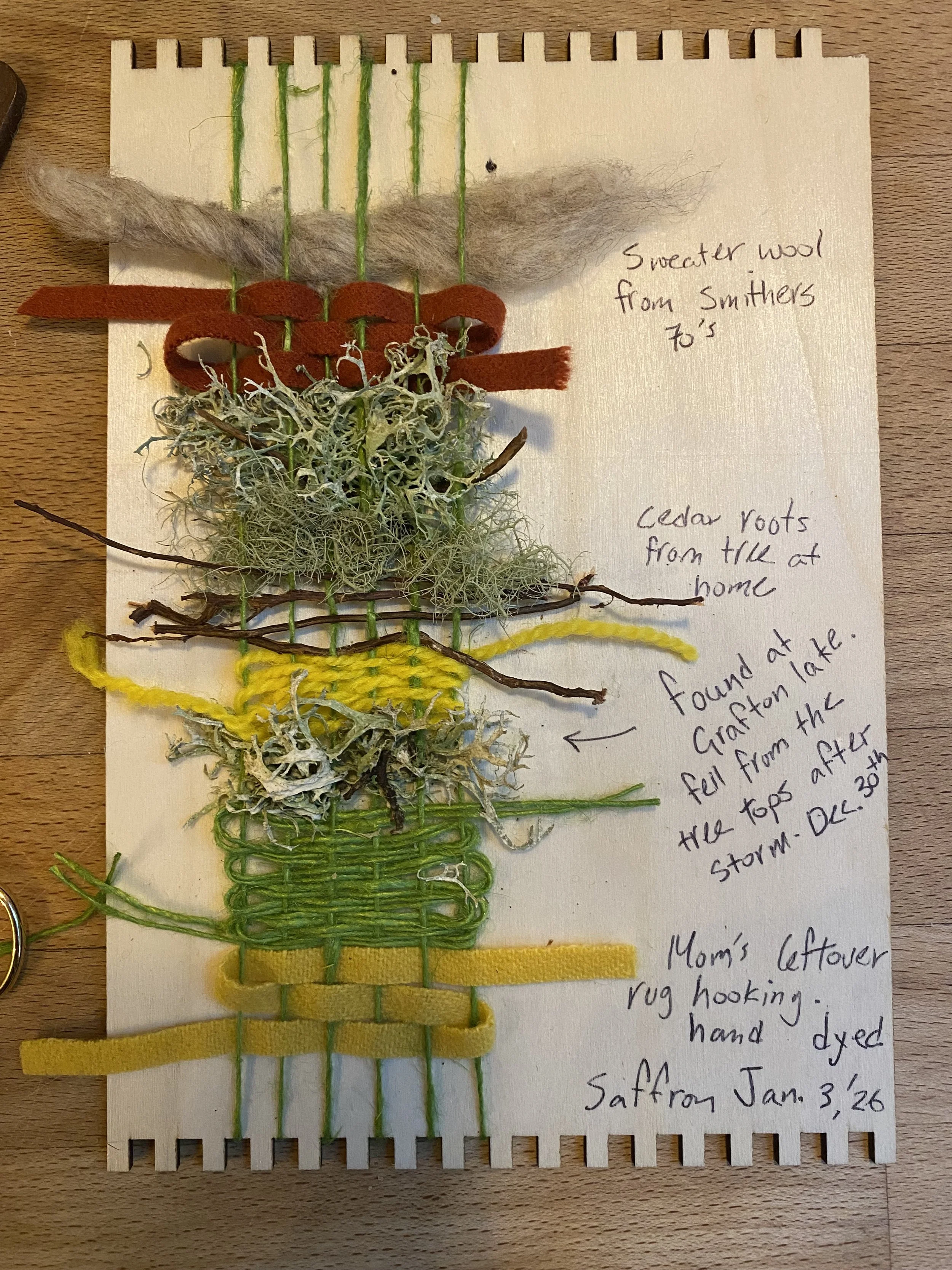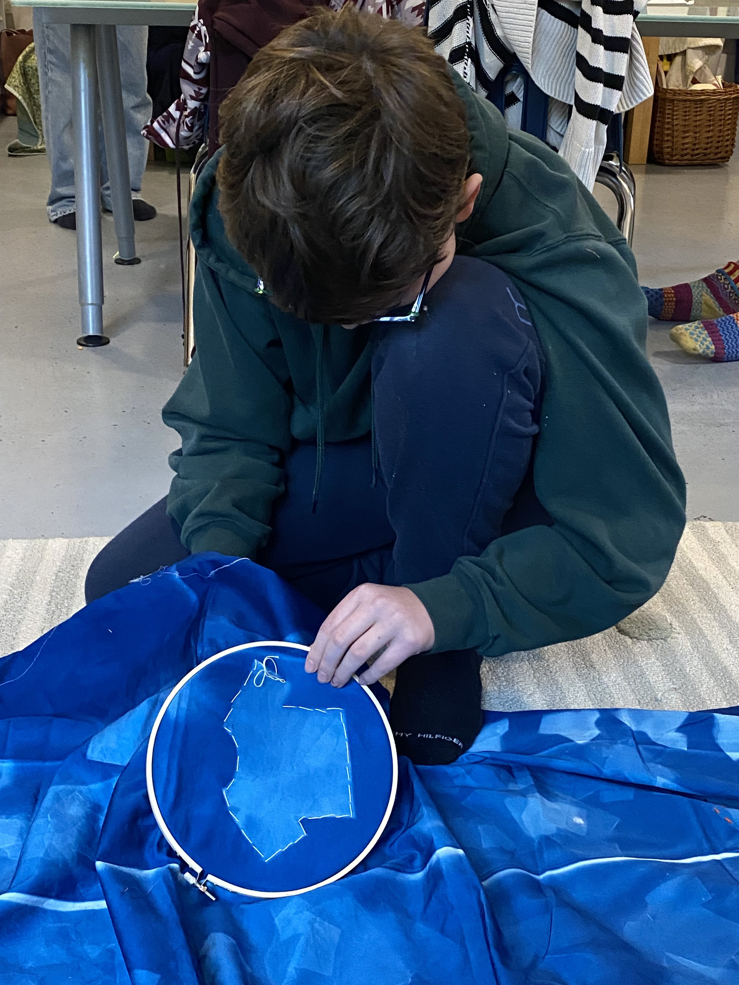 Students worked with mentors from the community including members from The Bowen Fiber Arts Guild. Grant funding was provided by the Bowen Island Small Grant fund from the Vancouver Foundation. This grant supported the making of small mending kits for the visiting public to take home and try some mending themselves. This is an important central theme of the exhibity in with students , while learning important mending guilting, weaving and stitching skills, reflect on their position and role as learners AND teachers in the generational cycle of oral and visual teaching.